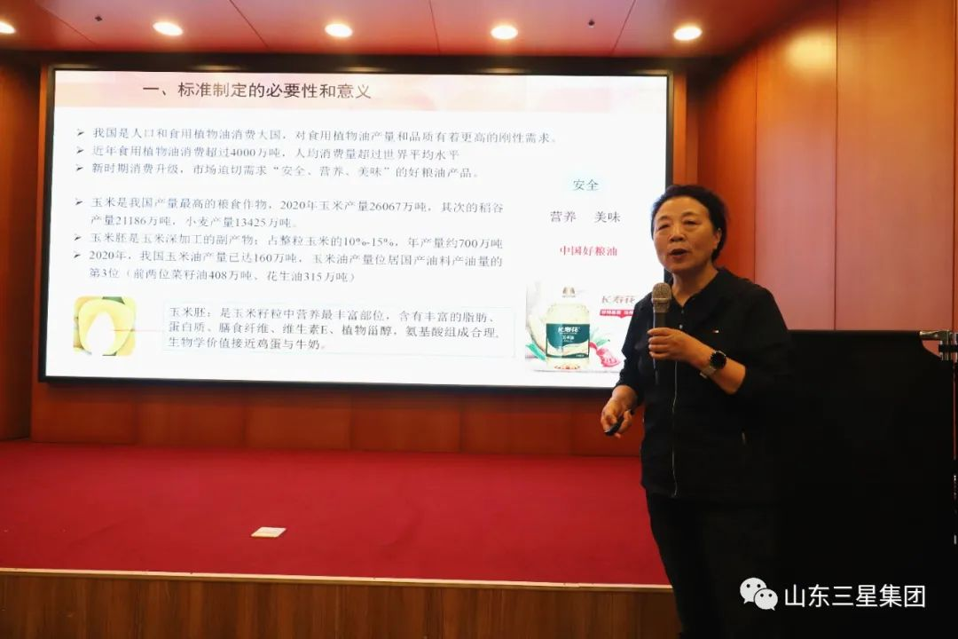 會上,中國糧油學(xué)會油脂分會副秘書長、河南工業(yè)大學(xué)教授劉玉蘭作標準報告,講述了《特級玉米油》標準制定的必要性和重要性,介紹了特級玉米油標準的適用范圍、規(guī)范性引用文件、術(shù)語和定義、質(zhì)量要求、檢驗方法、檢驗規(guī)則等八個方面內(nèi)容。她表示此項標準的制定有著扎實的工作基礎(chǔ)和厚實的研發(fā)成果支撐,特別是第一起草單位長壽花食品對《特級玉米油》標準制定及中國玉米油行業(yè)發(fā)展起到了當之無愧的引領(lǐng)和推動作用,并期待標準盡快發(fā)布實施,助力國家玉米油產(chǎn)品和技術(shù)創(chuàng)新升級。