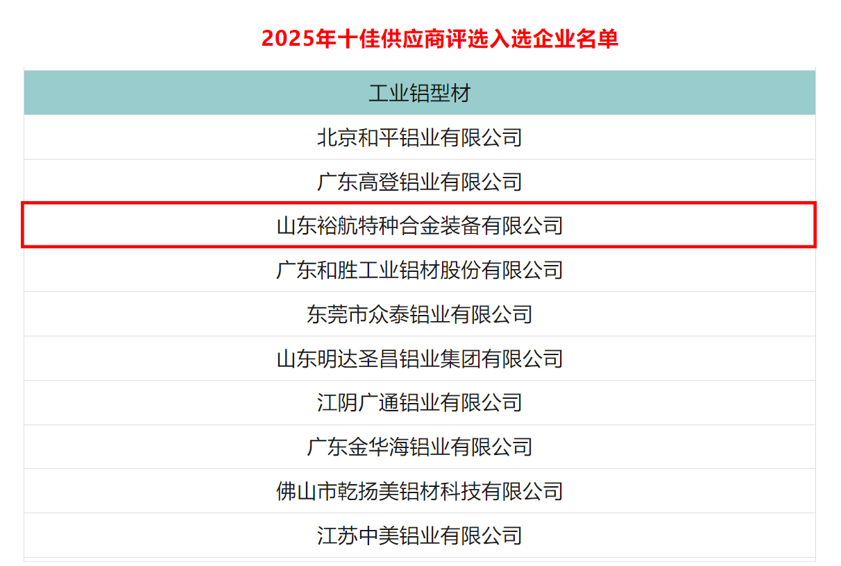 喜報!裕航合金公司入選2025“工業(yè)鋁型材”十佳供應(yīng)商