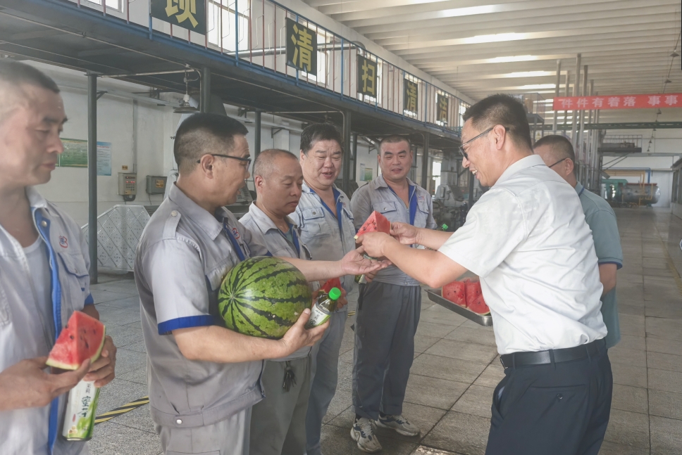 近日,持續(xù)的高溫天氣給堅守崗位的一線員工帶來嚴(yán)峻“烤”驗。為切實保障炎炎夏日一線員工身心健康,長壽花糧油加工公司執(zhí)行總經(jīng)理王學(xué)剛、長壽花食品科技公司執(zhí)行總經(jīng)理王奎帶著西瓜、涼茶等降溫物品深入生產(chǎn)車間一線,為員工送去清涼與關(guān)懷。