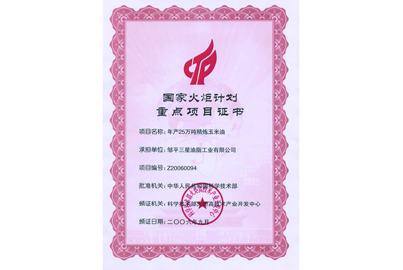 國(guó)家火炬計(jì)劃重點(diǎn)項(xiàng)目證書
